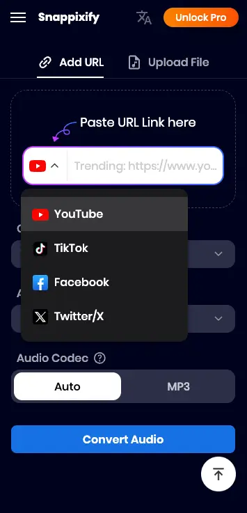 Step 2: You can easily convert both URLs and uploaded files to MP3. Simply paste the URL from platforms like YouTube, Spotify, SoundCloud, Facebook, Instagram, TikTok, and others, or upload your own files for conversion.