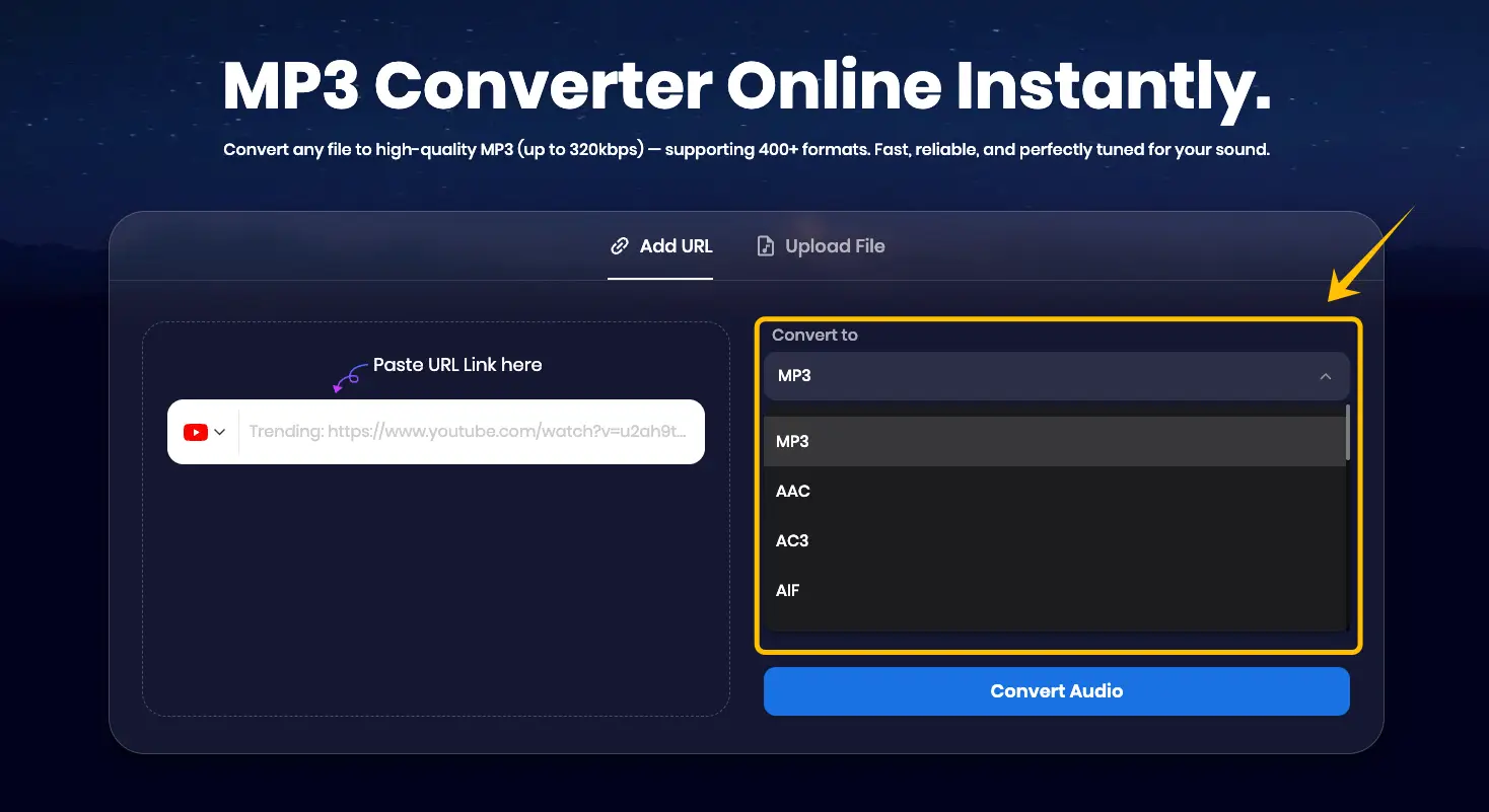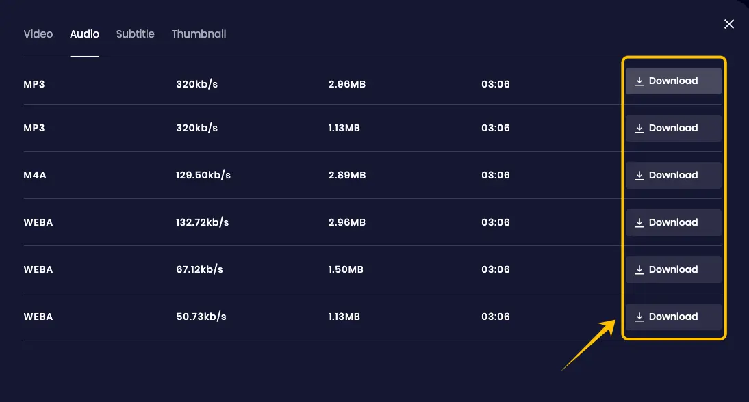 Select & Download: Go to the "Audio" tab, select the MP3 format, and click download.