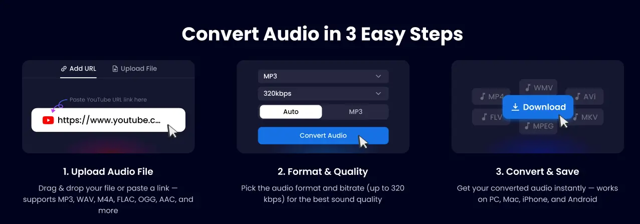 Why it matters: Different audio converters support different file formats. You’ll want to choose a tool that supports the formats you use most often, such as MP3, WAV, M4A, FLAC, and others. Some converters also allow video-to-audio conversion or the ability to extract audio from video files.