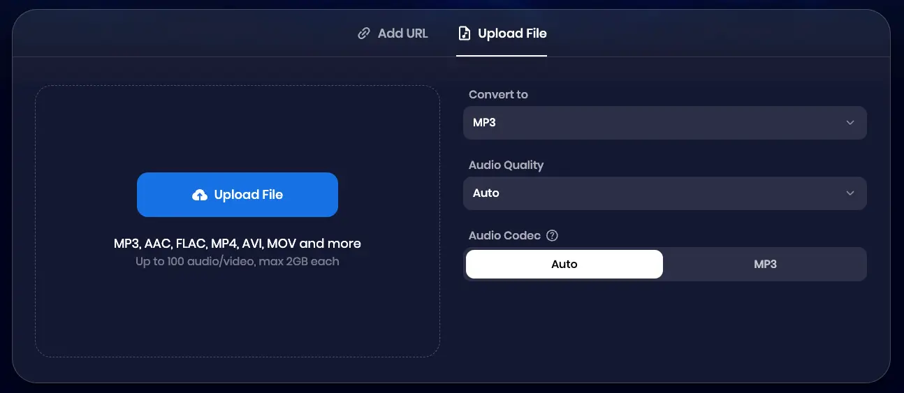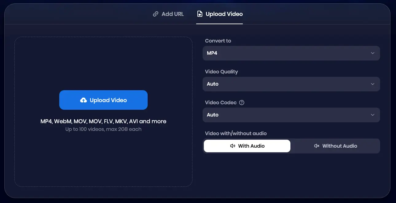 Drag and drop your video or audio file into the tool, or simply click the "Paste URL" button. Our secure converter supports all popular formats, making it easy for you to work with any file.