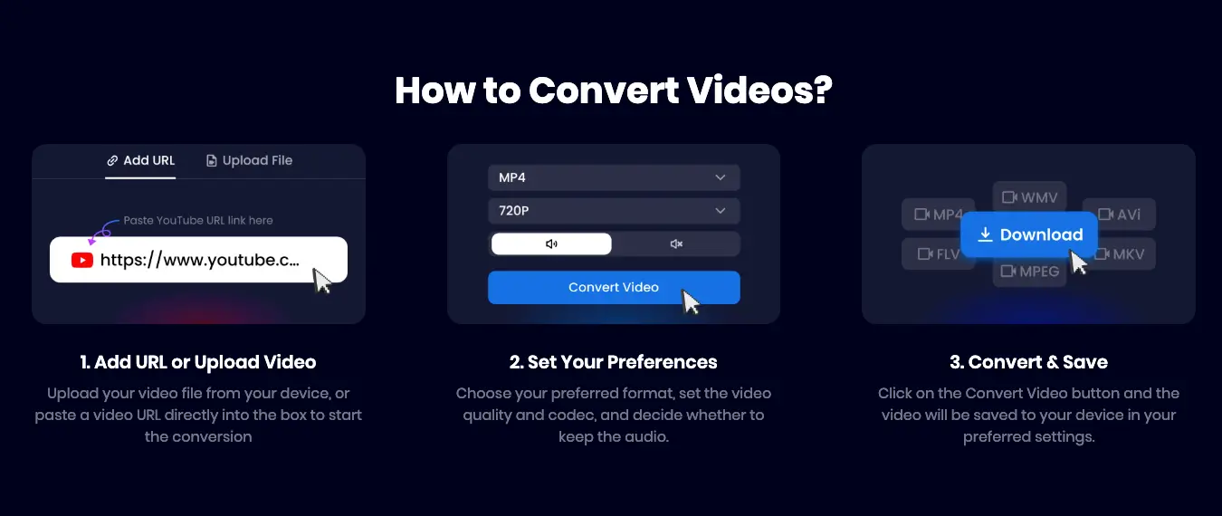 Under “Choose your preferred format,” select your desired conversion category (MP4/H.265), set the video quality and codec, and decide whether to keep the audio.