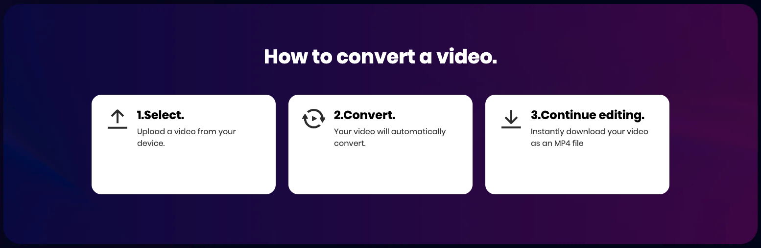 To convert a video, first upload your file or paste a video URL to start. Next, choose your preferred format, adjust video quality and codec, and decide whether to keep the audio. Finally, click the convert button, and the video will be saved to your device with your chosen settings.