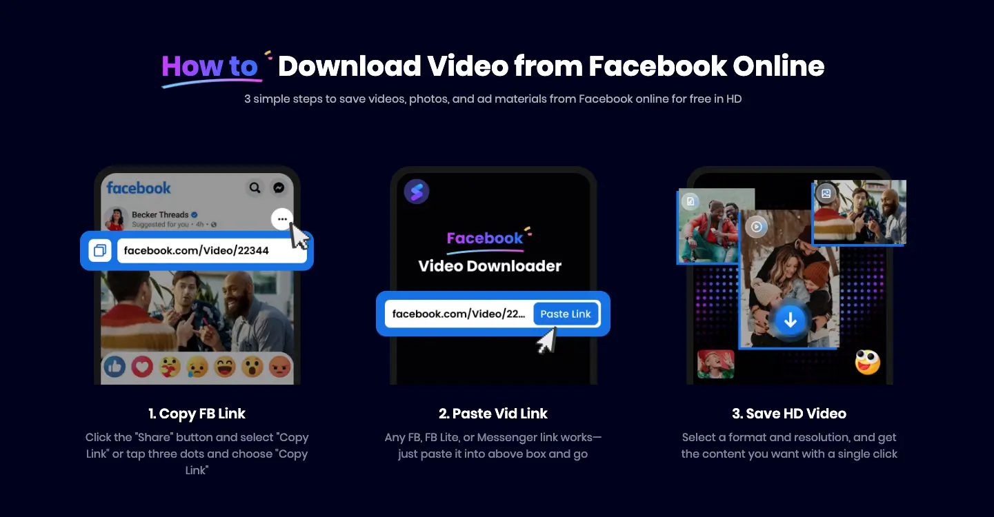 Copy: Find your target video on Facebook, click "Share," and copy the video link.