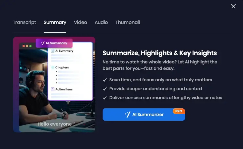 Scenario Example: A marketing analyst watches a 2-hour webinar on digital trends. Using our tool, they instantly get a crisp summary and actionable insights. Then, leveraging the structured transcript, they quickly create a detailed LinkedIn article and a series of social media snippets — all in under an hour.